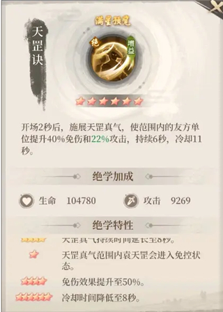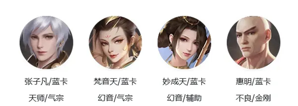 梵音天和妙成天有控、有盾,能和女帝凑成3幻音羁绊(演奏红蓝音律,红色音律输出伤害,扣除内力,蓝色音律提供治疗和攻击加成)慧明能提供护盾和治疗,能和袁天罡组成2金刚羁绊(为自己和队友提供护盾,自身获得的护盾翻倍)。张子凡本身就是6气宗羁绊组件之一,能和张玄陵组成2天师羁绊(开场自带威压,敌方攻速降低,攻击降低)。