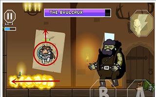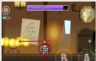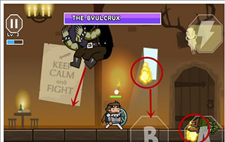 BOSS吐出的第二种火焰位置是在上方的,玩家无法用跳跃躲避,这时候要向下滑动屏幕,玩家下蹲才能躲避火焰,如图所示。