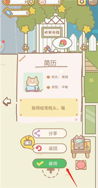 1、首选从本站下载猫猫水疗馆游戏,并运行打开,进入游戏 2、进入游戏后先进行水疗馆开业,雇佣员工