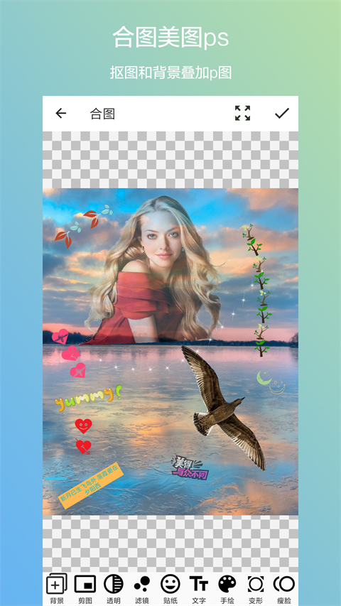 1、【合成】 真正的美图利器,秒变白富美,极显高大上。山川做底色,明星来陪衬。快用多发,让别人追不上 2、【抠图】 智能抠图,边沿光滑。强大的抠图编辑功能,展现细节,实现完美。PS必须边沿光滑,而边沿光滑,只在和图 3、【拼图】 融合拼图,叠加拼图。有层次,有形状,有背景,有文字,插画手绘,技艺超群。人生必须拼,敢拼才会赢 4、【头像】 轻松生成精美头像。圆形,心形,花形,文字,签名,背景,应有尽有,你要星星,你就加 5、【艺术】 波纹,花边,滤镜,贴图,格局,色彩,书法,让你心灵触动,闪现艺术作品。有品位,在“和图” 6、【出众】 200多幅贴图,100幅背景,260多款合成模板,9种可爱字体,20多种滤镜,几十种边缘效果,独有的可编辑手绘线型,资源丰富色彩斑斓软件功能