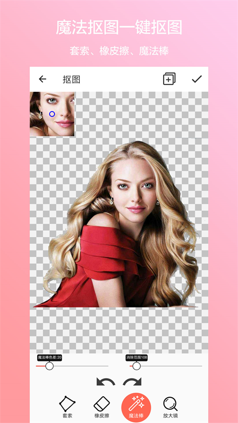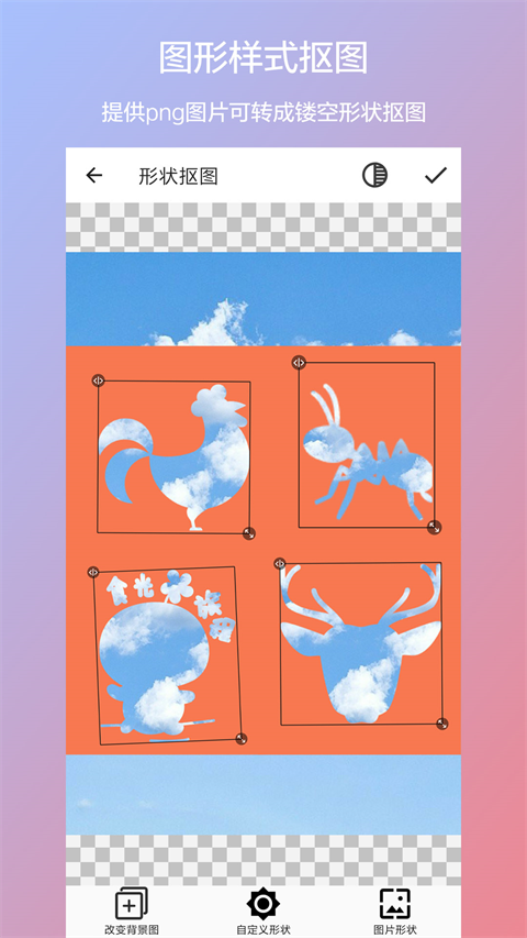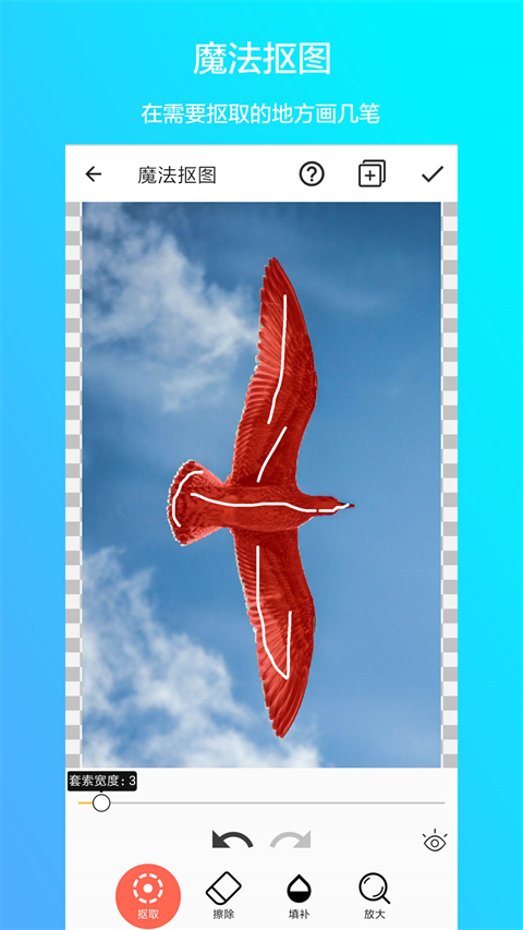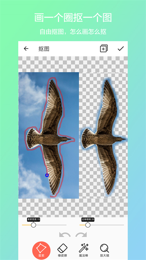 1、自由抠图,怎么画怎么抠。画一个圈抠一个图 2、魔法抠图实现一键抠图,只需在要抠取的地方画一笔即可自动识别 3、自定义抠图边缘,当手绘抠图形状不精准的时候进行边缘适当模糊羽化处理,让图片看起来更自然 4、抠图自然随意,操作方便快捷 5、几何形状抠图,只需调整参数就可以实现自定义角度、边角、边框样式的形状图形 6、图形样式抠图,只需提供png图片即可转成对应镂空形状进行抠图更新日志
