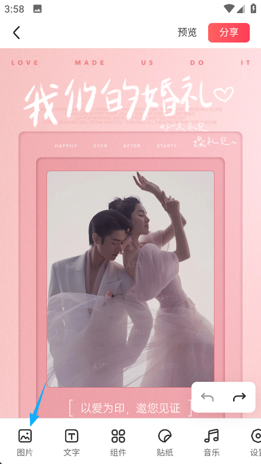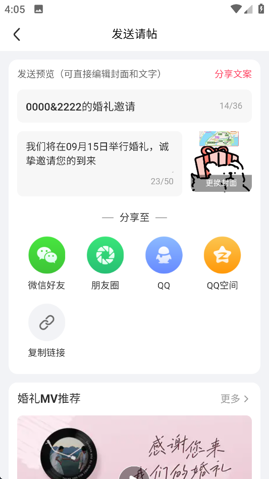 13、电子请柬这样就完成了,随后还可以点击屏幕中间部分,一键分享至微信或QQ了。