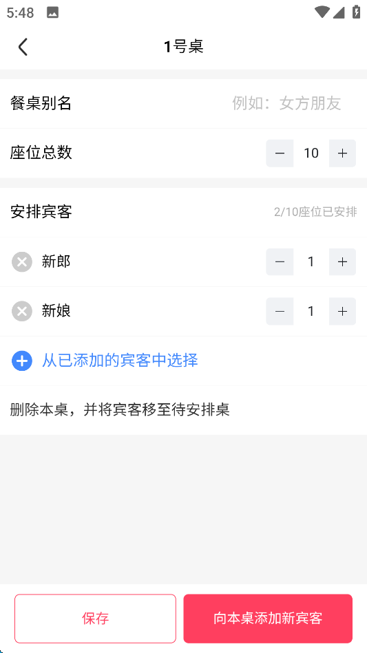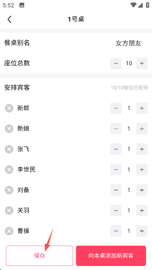 4、设置相关信息,随后点击屏幕右下角的“向本桌添加新宾客”。