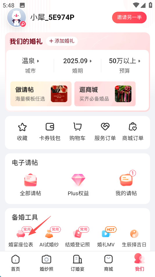 2、点击屏幕左侧(功能位置不固定)“备婚工具”板块的“婚宴座位表”。
