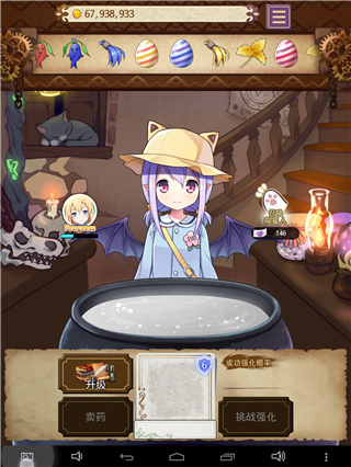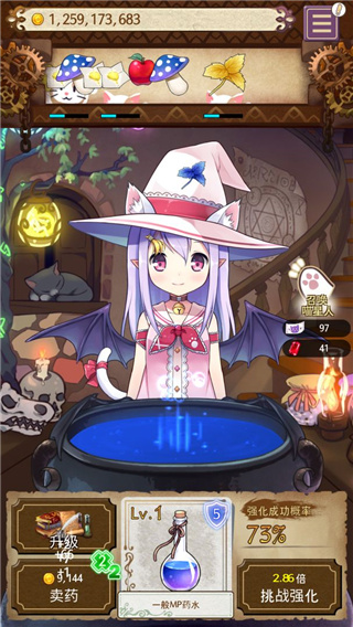 我们的目的是 从上面不断经过的无限的药材里 选一个丢进锅里 作为初始的 决定药水种类的材料 然后疯狂的从上面丢材料进去多多益善然后拼脸强化 做完要求的任务 失败没有惩罚但是某些任务很值得做 比如给猫券和盾牌 强化加成的某些任务 强化加成倒是没什么必要 盾多就行了 猫券有两个用途 在上面布置一个猫(可能会出现高级别的黑猫) 猫会根据你猫的等级提升丢药草的速度和黑猫的出现率(抱歉这里没截图 请大家用身体来体会哦~) 猫的存在时间是1分钟 但是貌似你不开始放草药是不会掉时间的