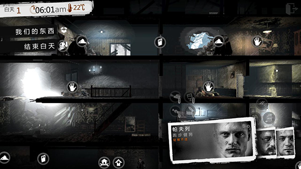 1、这是我的战争苹果版的创作灵感源于现实; 2、可控制幸存者以及经营藏身处; 3、可制作武器、酒精、床铺、火炉等一切有助于你生存的东西; 4、往往需要在进退两难的情况下狠心做出决定; 5、每次开始新游戏时,都将随机生成世界与角色; 6、灰暗的画面风格与游戏主题相得益彰。这是我的战争苹果版游戏攻略