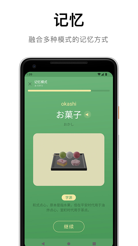 融合了多种记忆模式的学习方式,根据遗忘曲线和熟练度进行强化复习。并能够配合学习进度学习一些实用的日语单词。
