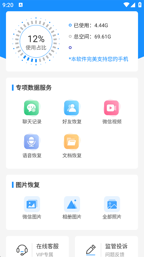 1、兼容强大 能够完美兼容市面上的手机机型,满足不同手机用户的需求。 2、恢复类型 支持恢复微信聊天记录、微信好友、微信视频、微信语音、微信图片、手机图片等各类数据。 2、恢复优势 深入手机系统底层,支持一键扫描误删数据,快捷方便恢复误删数据。 应用系统级数据提取技术,全力保障用户数据安全和隐私。软件特色