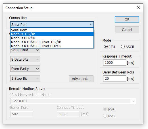 提供5种不同的连接类型,但是其中只有2种是标准Modbus连接: