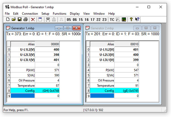 Modbus Poll使用多个Windows用户界面。这意味着您可以打开几个窗口,同时显示不同的数据区域或来自不同从站ID的数据。您可以在Alias单元中写入任何文本。 在任何对话框中,您都可以按F1键以获取有关该特定主题的更多帮助。 这张图片显示了两个打开的窗口,一个窗口从ID 1,地址0读取10个寄存器,另一个从ID 2读取10个寄存器。 如果您的从设备允许您更改保持寄存器,则双击该单元格,或只是开始在该单元格中输入新值。然后显示一个编辑对话框。