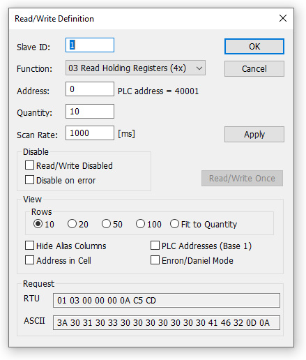 在这里,您可以定义要在窗口中显示的数据。该设置显示了如何从地址0读取10个保持寄存器。在某些协议说明中,地址为40001。请注意,Modbus轮询使用始终从0开始计数的Modbus地址。