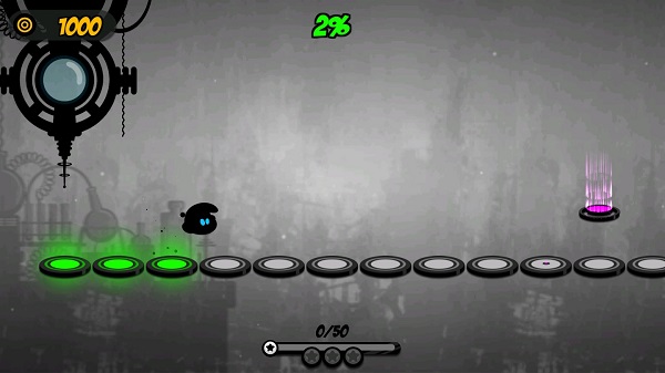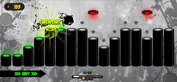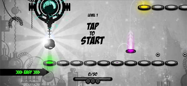 一、基本玩法 《永不言弃2》在玩法上与《永不言弃》相比基本没有什么变化,游戏中的每一关只要让小墨点到达终点即可。话虽如此,可是做起来却又是另一回事。在操作方面玩家全程只需要在屏幕上点击即可,当小墨点着地时点击即可获得完美起跳,也只有这样才能真正完成一次大跳跃。