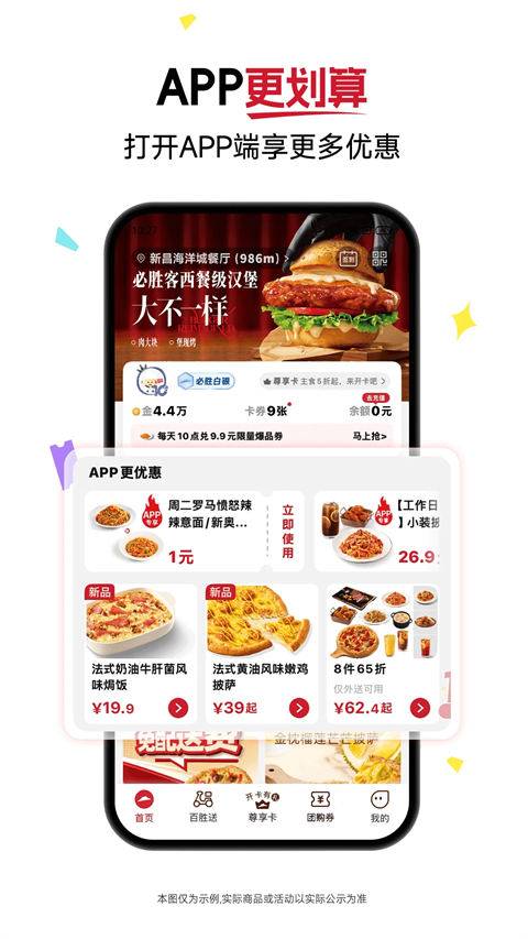 【首页焕新,体验升级!】 必胜客APP超多优惠活动,吃喝省钱又省心。 -首页弹屏、顶部橱窗选择更灵活:外送、外带、堂食可一键跳转 -会员体系升级,全新「会员中心」登场,查看升级保级进度。 -「我的」页面布局升级,「领券中心」好礼月月不间断。 -「优惠中心」新增会员权益券领取,轻松得优惠。 其他已知功能修复及优化