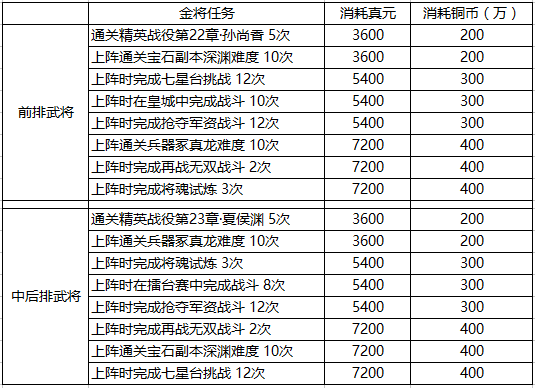 根据图示,站位相同的武将是一样的进阶任务,而在12.0中真元每日极限产出在7000左右。故此,综合任务进度与资源进度来看,主公完成一名武将的金将任务大概在7-11天。