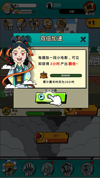 5、每播放一段小电影,可立即获得2小时产出翻倍~,点击直接获得。