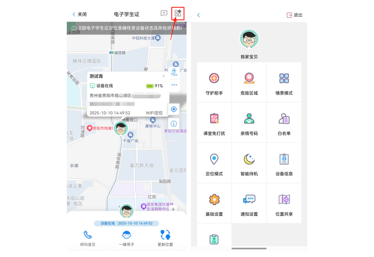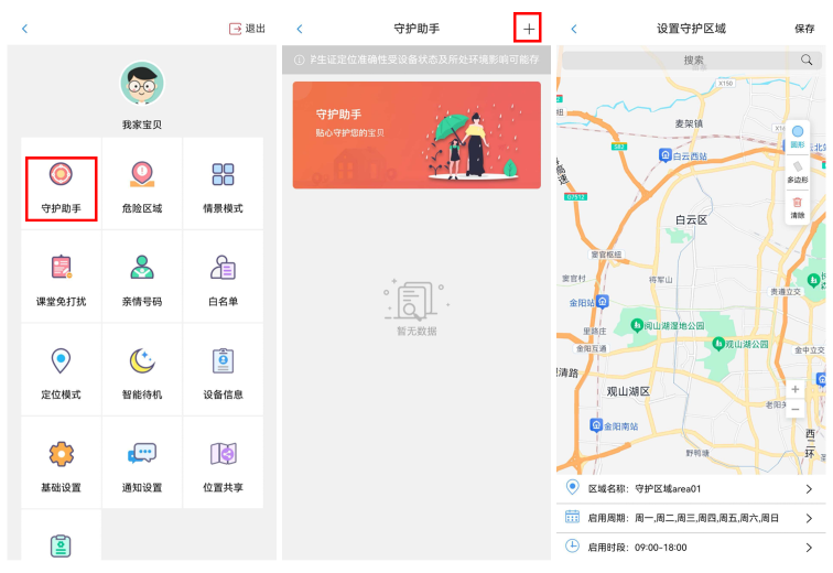 设置 “安全圈”,进出自动预警守护助手是电子学生证的核心安全功能模块,通过点击"守护助手"界面的"+"标识,可启动安全区域绘制功能,支持圆形及多边形围栏形态设置,实现精准活动范围界定。选区域形状:圆形(适合家、兴趣班,建议设 500 米范围)、多边形(适合学校校区,精准框选教学楼 / 操场);填区域名称(如 “贵阳市 XX 小学”“家”),设生效周期(学校选 “周一至周五”)和时段(如 “7:30-16:30”)→保存;