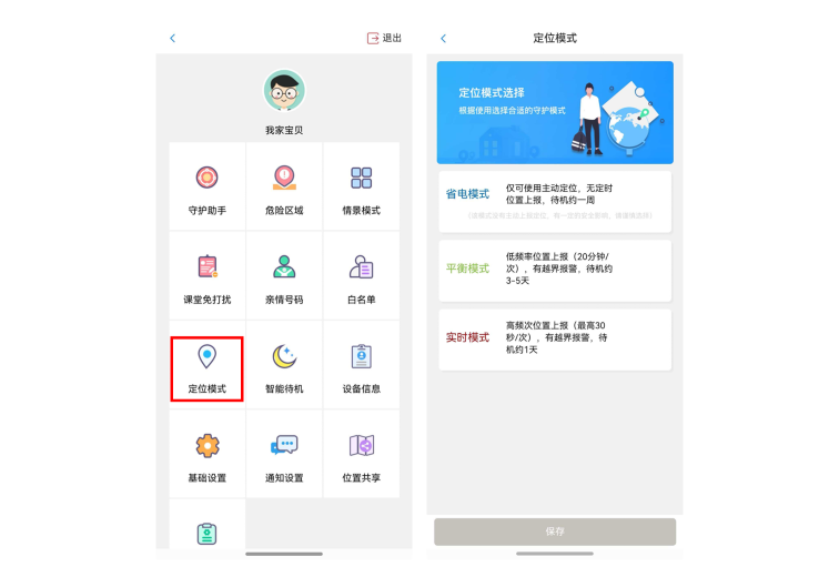 3 种模式按需选,安全又省电定位功能支持家长按需使用。通过点击"定位模式"选项,自主选择不同定位策略,实现定位频次与设备续航的精准调控。