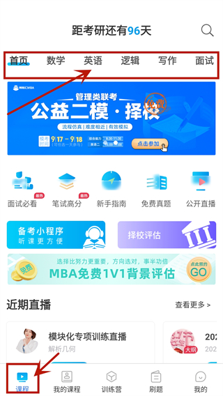 “数学、逻辑、英语、写作”四大科目、“历年真题题库、押题预测,专项训练系统”三大刷题模块。