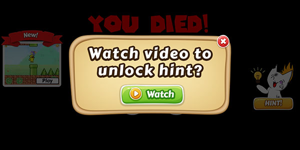 4、如果卡在某个地方的陷阱过不去,可以在失败界面点击右侧的HIT猫咪来获取提示。