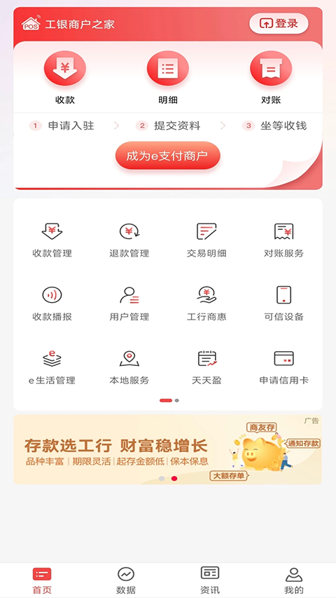 1、下载工银商户之家APP,安装成功后打开 2、点击成为e支付商户