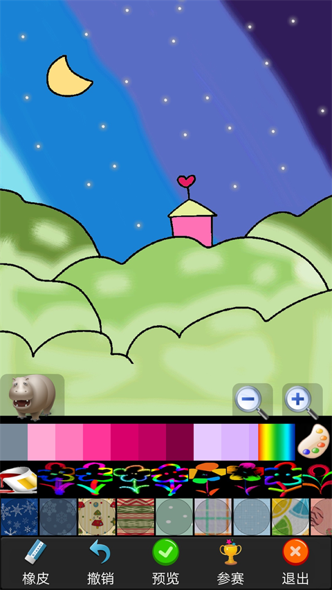 1、海量画笔,包括油漆笔、光润笔、蜡笔、油墨笔、荧光笔、方头笔、彩环笔、毛笔、钢笔、炫彩笔和纹理笔等超过100种 2、简笔画,和纸质简笔画类似,可照着涂鸦画画,简笔包括动物、风景、人物和水果等 3、印章,包括可爱动物、体育用品、日常生活用品、海洋动物等 4、涂色小屋,海量涂色本,包括动物本、植物本、童话公主本和各种动画片人物本等 5、万花筒,10种花式,创造出奇幻花筒 6、荧光绘画,可参加绘画大赛,您可以查看往期经典作品,动画视频播放其他绘画作品,边学边创作 7、沙画,在各种沙子上作画,还有海洋生物和用品的印章 8、毛笔字,根据重力感应的高仿真毛笔,练习毛笔字的好助手 9、绘画跳舞,画出来的动物模型会跳舞哦 10、绘画教程,包括简笔绘画教程、素描教程等 11、相册,实时保存绘画作品,可分享或在以前的作品基础上继续创作 12、图片处理,绘画作品可以通过像素化、风格化和颜色化等多种模式处理后保存或分享 13、多种绘画模式,包括随心涂鸦、简笔画和萌宝横屏绘画模式 14、各种屏幕支持,包括tablet平板、手机等 15、新增了钢琴、木琴、拼图、颜色、五子棋、找茬等多种玩法软件亮点