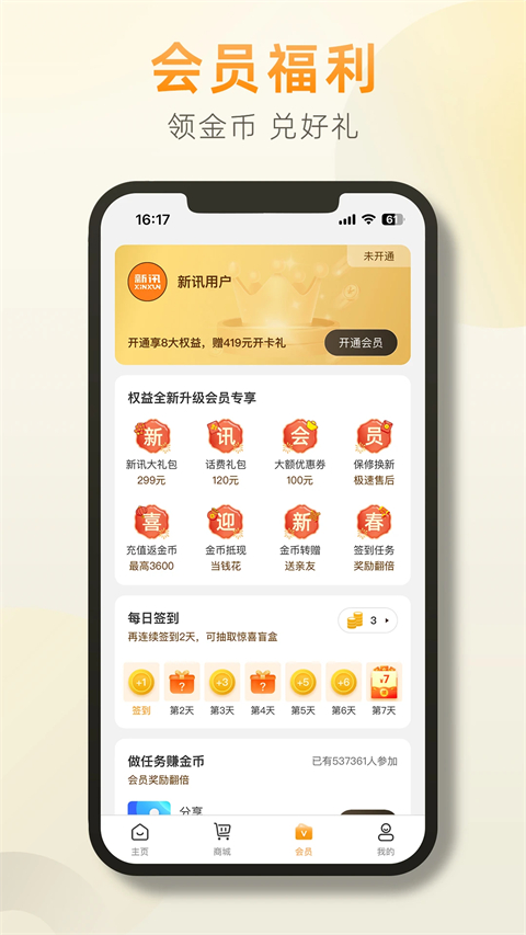1. 优选随身路由、监控、穿戴等智能通信设备 2. 手机话费低至9折 3. 分享、签到赚积分,积分抵扣金额,积分当钱花 4. 各大音视频、办公会员月卡、年卡,直降70起新讯App随身WiFi怎么充值激活?