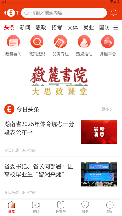 1、教育资讯发布 提供最新的教育资讯,帮助用户了解教育动态。 2、政策解读 对教育政策进行详细解读,使用户更好地理解政策内容。 3、信息服务 包含考试报名信息、在线学习资源等,满足用户不同的学习需求。 4、校园活动展示 通过图文、视频、直播等多种形式展示校园活动、师生风采和教育教学资源。 5、视听直播 提供教育类短视频和直播内容,用户可以参与教育内容生产。 6、数字化特色课程 提供优质的数字化特色课程,支持智能搜索和便捷操作。湖南教育发布App怎么查询高考成绩?