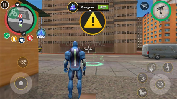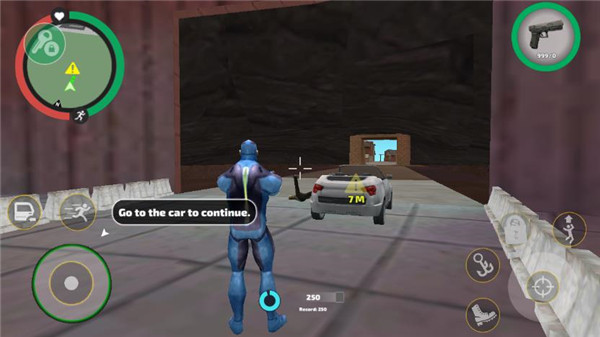 1、游戏中的图标和按钮功能,左边从上到下可以看到地图、奔跑、移动等按钮,右半从上到下分别是显示能量、血量、上车、跳跃、绳索、攻击、脚踢,除此之外用手指滑动屏幕还可以控制视角。 2、所有的按键中的“上车”按钮必须要自己周围有车辆的是才会出现,“脚踢”按钮也要身边有东西的时候才会出现。 3、当我们上车之后,按钮就会自动切换为驾驶模式,驾驶模式中左下角是方向按钮,通过左右拖动“方向盘”来控制方向,右下角的左边是刹车、右边是油门,可以控制车辆的速度。玩家们想要下车只要点击屏幕右边灰色的车辆按钮即可下车。