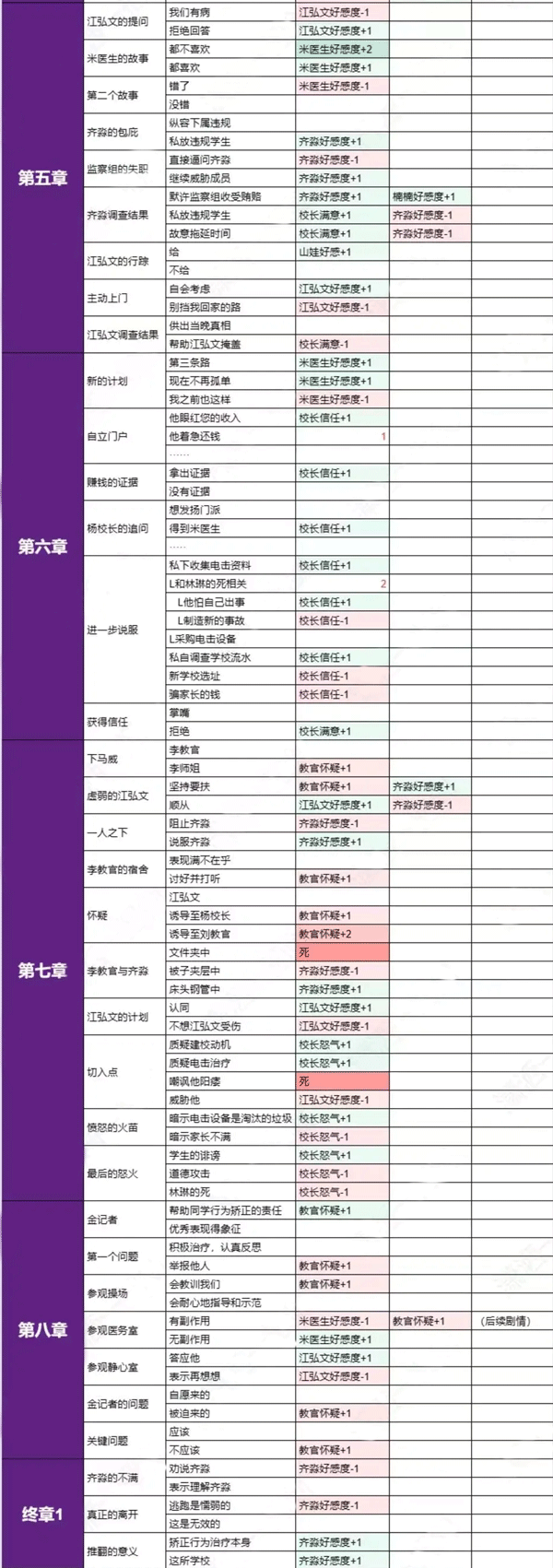 下面是全章节全角色的好感度选项表格: