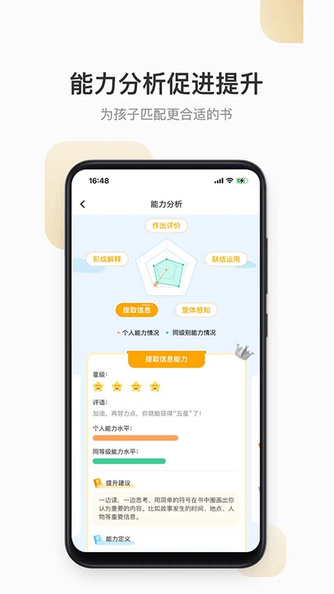 1、分级的阅读方式让每个孩子逗爱上阅读。 2、通过视频的导读形式更加吸引孩子的阅读兴趣。 3、通过能力的分析促进提升匹配更为合适的书籍。 4、共享阅读的成果共同互动激励进步。软件功能