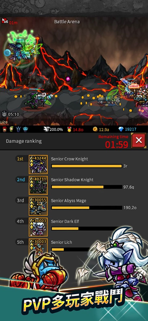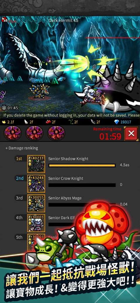 1、你可以不断复活那些因为战斗死去的骑士,请不断的升级自己勇士的各方面属性! 2、你可以对自己团里的勇士进行转职,多达100多种特色的职业可选! 3、你的目标就是不断的挑战大魔王,即便是耗尽一万年时间也在所不惜!更新日志