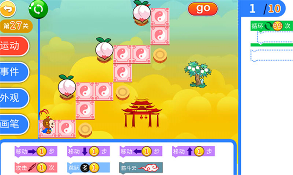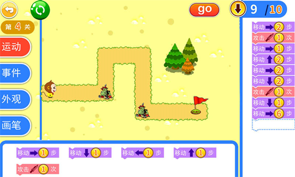 1、从易到难 循序学习函数:移动、攻击、跳跃;学习事件、画板、逻辑、数字等编程知识和技巧。 2、寓教于乐 通过悟空一行西游取经的故事,通过搭建程序积木块,实现移动、攻击打怪、解救师傅等环节。寓教于乐,轻松学编程。 3、思维训练 根据程序学习进度,依次打开思维训练环节比如:接电线、人鬼过河、青蛙过河等;依次打开算法和训练环节:排序算法、数据结构等。软件亮点