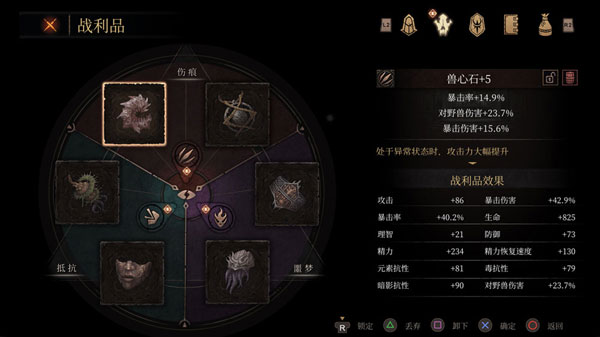 游戏中战利品分为伤痕,抵抗,噩梦,每系能装备俩个,也就是一共6个装备栏,伤痕推荐父爱(第二章完成支线主线)伤痕圣剑,(第六章完成支线主线三选一)狂沙胸针(花支配者结晶在马车上女枪那里购买)抵抗推荐种子(打完第七章boss后掉)抵抗圣剑(第六章完成支线主线三选一)白卵(第五章支线帮助敲钟人打完boss制作)黑手跑图神装(第六章流程中拿,具体不说了)女神像,过渡装,也是大佬追求极致输出的毕业装(女枪购买)噩梦推荐梅瓶(第四章与掘墓人对话拿)陶片(女枪购买)不存在之靴跑图神器(第三章比较隐蔽的地精花875骨粒购买,具体位置就不多说了)噩梦毕业装备还有很多,具体看自己选择,这里其他就不多说了