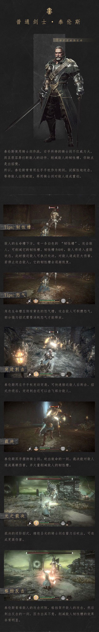 介绍一、 普通剑士·泰伦斯 玩家最开始就能使用的角色,也是每个关卡必带的角色,使用骑士剑和刺剑进行攻击。 特点:操作简单,容易精通。属性平衡,所以泛用性非常广,有伤害,有防御,有爆发,在异常状态下伤害会进一步提升。 缺点:比较平衡的属性,导致没有突出的特长。 攻击 ★ ★ ★ ★ ☆ 防御 ★ ★ ★ ★ 机动 ★ ★ ★ ★ 难度 ★ ★ ★