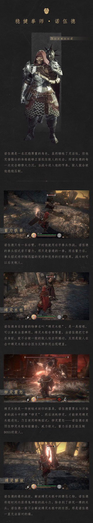特点:他的防御可以挡住大部分攻击,缚灵木柩的攻击威力非常高,且攻击动作不容易被敌人打断,攻击成群的敌人非常有效。拥有出色的防御力。在使用“缚灵解放”后,在短时间内可以造成爆发性的伤害。