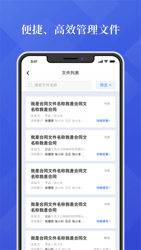 1、便捷:告别纸质合同,随时随地签署电子合同、查阅电子合同、下载电子合同。 2、高效:采用有效电子签名技术确认合同签署主体真实身份、记录合同签署时间,防止合同被篡改。 3、合规:遵照《合同法》、《电子签名法》相关规定,电子合同法律效力获得仲裁/司法机构认可。 4、广泛:适用于旅游电子合同、租赁电子合同、租房合同、借款合同、劳务合同等多种合同场景。法大大app怎么添加电子印章