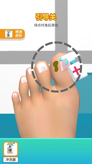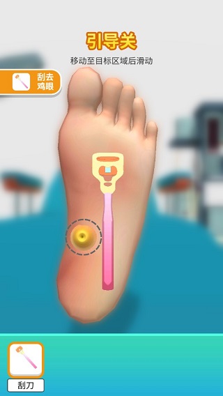 游戏玩法采用了时下流行的模拟体验方式,玩家在游戏中借助各种工具,对病人足底的各种疾患进行治疗,或是清除死皮、或是夹出尖刺、或是修剪毛发、或是美足护肤,从最基础的清理开始做起,从关卡中获取收益,开启更多的专业工具,再借助工具的开启,逐渐提供更加专业、高深的足底服务,获取更大的资金,逐步装饰自己的诊所,最终将诊所打造成令人梦寐以求的知名诊所。