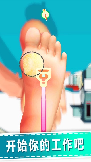 画面采用了3D立体设定,独特的诊所场景,随处可见各种专业的器材与设备,宽敞明亮的场景、经典别致的装备,为玩家呈现出令人愉悦的视觉享受。游戏中的角色采用了真实的比例,尽管细节并不丰富,却也透过肤色、发行、着装等细节,描绘出一个个有血有肉的虚拟人类。而游戏中最为关键的足部疾患,也会随着关卡的提升从最开始的简单操作,逐渐升级为步骤相对繁琐的各种专业操作,当然这些专业操作都是经过简化的。