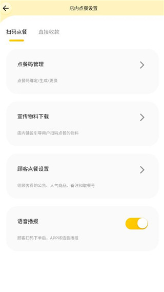 2、打开点餐设置,里面可以管理点餐码、顾客点餐设置、语音播报等