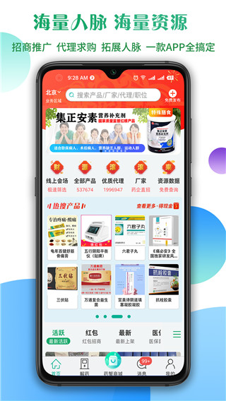 1、全国百万资源免费查询,医院、专科、药企、保健品,应有尽有,永久免费 2、海量人脉,海量资源,招商,代理,求购,拓展人脉 3、厂家直招,一键拨打电话,找产品,找厂家,一键联系招商经理 4、全新访客功能,身份区域一目了然。一键筛选意向客户,高效率办公 5、百万代理,求购信息,丰富的信息展示形式,急求模式快速找到品种传奇医药网app怎么发布代理和求购信息