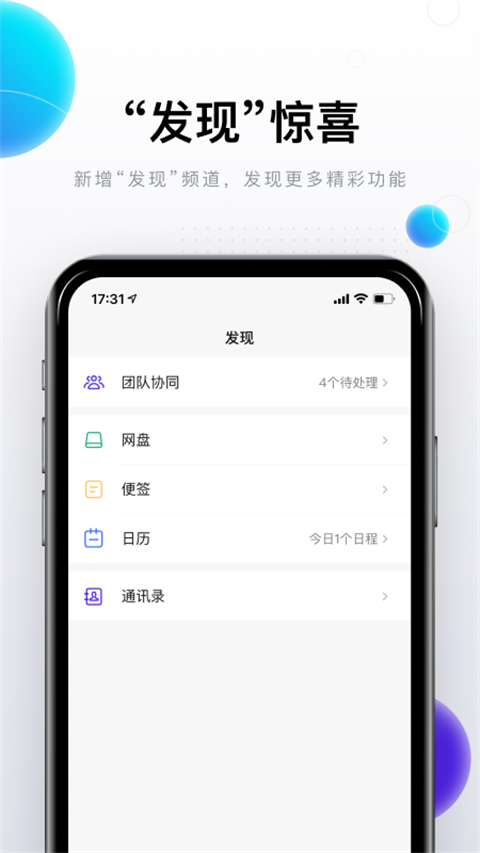 1、发现惊喜。新增发现频道,发现更多精彩功能。 2、丰富审批方式。适应多种审批场景,告别复杂的审批节点。 3、多端同步便签。多端同步,随时随地记录所思所想。 4、极简日程管理。极简高效日程管理。软件优势