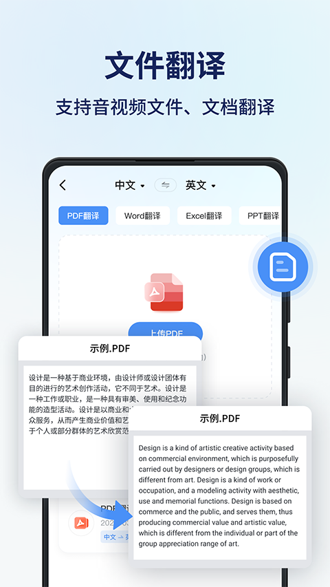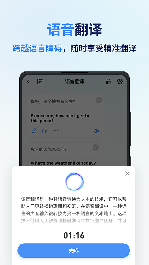 1、同声传译 边说边译,识别快速且正确率高同时支持悬浮字幕功能以及实时转写翻译浏览;支持同步保存录音文件,可回放重听,可继续进行同传;内录外录随心切换,从此告别噪音困扰。 2、语音翻译 输入语音内容,实时语音翻译,智能翻译成您所需要的语言。 3、虚拟人口语陪练 通过利用先进的人工智能技术,模拟真实对话环境,为学习者提供与虚拟角色进行口语交流的机会。发音标准纯正,美式及英式口音兼备。通过与虚拟角色的互动,学习者可以锻炼英语口语表达能力,提高语言应用水平。 4、拍照翻译 拍摄所需翻译的文字内容,通过智能翻译模块,迅速的给出翻译结果;支持原图和翻译结果图片对照查看。 5、图片翻译 通过上传图片,由智能翻译识别模块精准地给出翻译后的文件。 6、文档翻译 支持导入各类文件,如pdf、word、excel、ppt和txt等进行翻译,准确率高翻译速。软件亮点