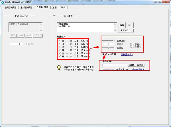 2、选择播音人,可选择四女两男,并调试播音的音量、语速和音调等内容,当然若用户需要播音背景可自定义选择