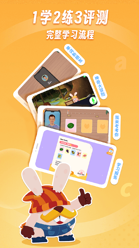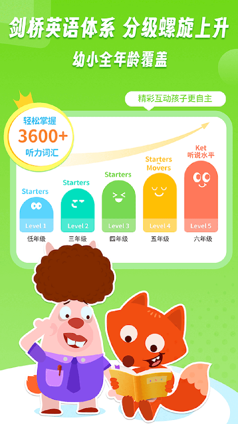 【风趣AI外教1对1授课】 采用外教1对1授课形式,融入丰富互动操作。专业又风趣的Jim老师与孩子全程趣味互动,根据孩子的参与表现给出恰当的反馈,给孩子带来超出传统外教课的体验感受 【采用剑桥教学体系】 课程设计依照剑桥少儿英语体系,对接欧标(CEFR)语言等级,1年课程完成剑桥Starters级别内容(国内小学毕业英语水平),3年可达到剑桥KET级别(国内初中毕业英语水平) 【线上中教个性化辅导】 课程采用班级化教学,营造课堂氛围,统一安排学习进度。同时为每个学生配备资深英语导师进行“1对1”课后辅导,实时跟进孩子的学习进度、及时反馈、点评学习报告、纠正发音等,保证教学效果 【完整教学流程】 围绕每节课核心教学内容和目标,设计预习-学习-练习-测评4个主要环节,形成教、学、练、测、评完整教学闭环,夯实孩子的英语基础,真正实现科学高效英语启蒙 【完善的教材体系】 一学年教材包含150本与课程配套的原创英语纸质绘本、精心设计的50个学习单元的纸质教材和50首原创英语教学儿歌MV,以及450张单词卡,多重场景辅助孩子学习。同时配套线上图书馆及全年N场外教直播课程,绝对超值更新日志