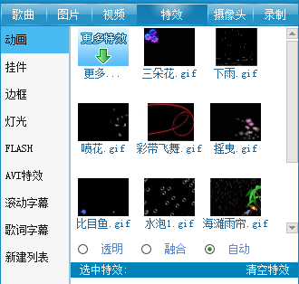 点歌台特效下载为您提供了海量特效素材资源,多个特效的叠加,让使用者的视频更加出色,同时支持JPG、GIF、FLASH、AVI等流行格式。