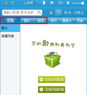 主界面的歌曲、视频、图片标签是你的虚拟视频添加选项。你如果想唱歌,那你就在歌曲标签中添加歌曲并播放,你就可以K歌了。