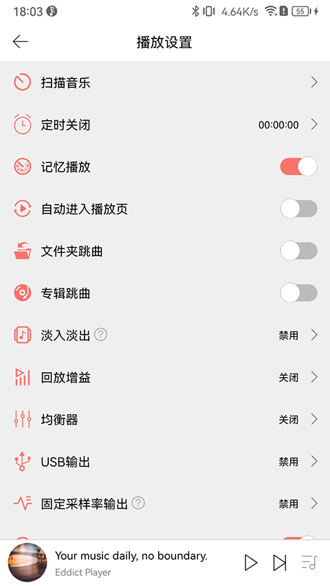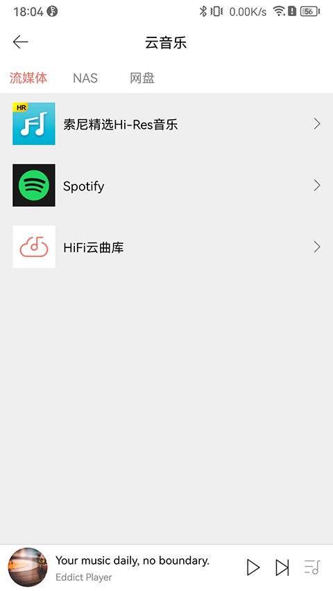 1、支持全格式无损音乐解码,如APE、DSD(DSF、DFF、DST)、ISO、WAV、FLAC、AiFF、M4A、以及AAC、WMA、MP3、OGG等; 2、Hi-Res高清音乐格式源码输出,可支持播放384KHz/24位音乐输出; 3、支持全部歌曲、文件夹、专辑、艺术家、风格分类,在歌曲浏览列表中可添加到播放队列、查看歌曲信息等; 4、内嵌HiFi云曲库,正版无损音乐播放,支持下载,内嵌Spotify流媒体音乐服务; 5、支持封面、歌词显示; 6、本地播放时,支持查看歌曲信息,手机上即可轻松进行歌曲管理; 7、支持WiFi传歌、SyncLink,支持LHDC蓝牙格式输出; 8、支持DLNA、Airplayer、NAS; 9、支持无线投屏; 10、支持通过UPnP浏览设备音乐资源和手机音乐资源进行设备的控制和播放,独立的设备管理; 11、支持个性化设置:如装饰背景设置、定时关闭、开机默认音量、断电记忆开关、文件夹跳曲、EQ等的设置; 12、全新UI设计。Eddict Player App怎么下载歌曲