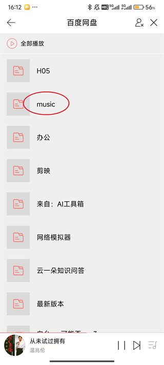 6、当然,登录的百度网盘,需要有音乐歌曲,否则无法显现。点击“music”。