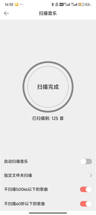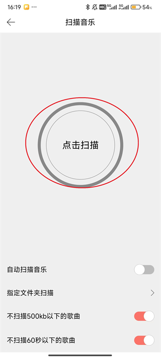 3、屏幕下方可以调整扫描本地音乐的范围,如果有遗落歌曲,可以放开条件,比如关闭“不扫描500kb以下的歌曲”和“不扫描60秒以下的歌曲”,调整完成后,直接点击屏幕中间的“点击扫描”。