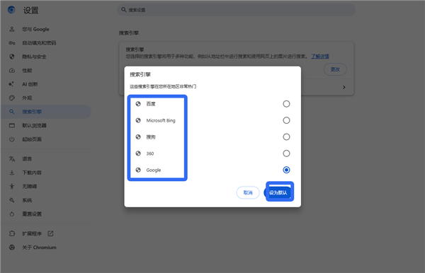 4、用户可更换为百度、搜狗、Microsoft Bing、360等引擎,选择好点击【设为默认】即可。